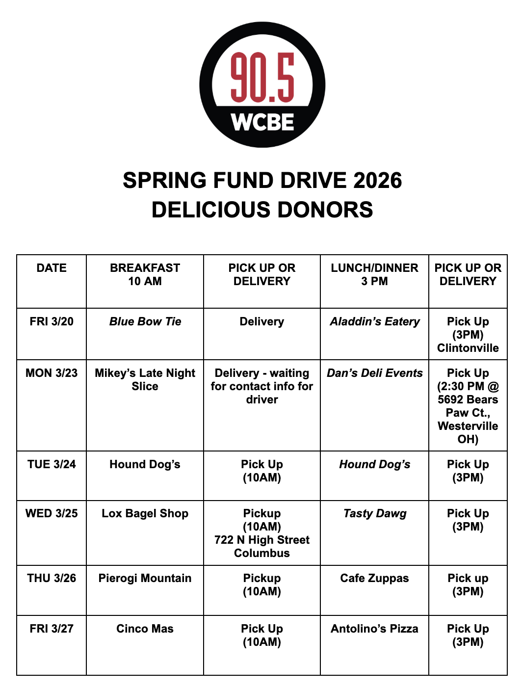 The main portion of my time during this segment of internship hours was put towards preparing for the Fund Drive. The rest of the Capital interns and I were tasked with gathering food donors for the event, called “WCBE Delicious Donors”. We reached out to local businesses and offered an exchange of services during the week of the drive. In exchange for providing a food donation for us and our station volunteers (around 10-12 people), we would give the food service an on-air shoutout every hour of the day they provided their donation, as well as including their business logo in a Thank-you graphic on the station website, WCBE.org. We reached out to almost 50 restaurants and food vendors around Columbus and were able to find both breakfast and lunch for all six days of the Fund Drive (Mar. 20th-27th not including weekends). The restaurants that were able to become Delicious Donors included Dan’s Deli, The Lox Bagel Shop, Cafe Zuppas, Blue Bow Tie, Aladdin’s Eatery, Mikey’s Late Night Slice, Hound Dogs, Tasty Dawg, Cinco Mas, Pierogi Mountain, and Antolino’s Pizza. This process of attaining the donors took around a month and we were able to secure the entire event with food donations about a week before the fund drive began. I personally got Dan’s Deli for the drive and corresponded with the owner while also helping out send follow-up emails and communications for places like Pierogi Mountain and Aladdin’s Eatery.