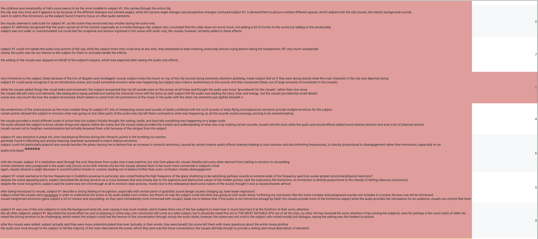 To conclude my senior project and audio perception experiment, I gathered and compiled all of my data into one single digital spreadsheet. Along with listing my own observations of the subjects, this compiling took anywhere between 25-35 hours to complete, filling almost one hundred rows and seven columns with paragraphs of data and thoughts on perception from subject to subject. I established a ranking of each film clip from most immersive to least, and after analyzing each subject’s immersion rankings, I was finally able to come to my first concrete conclusions.