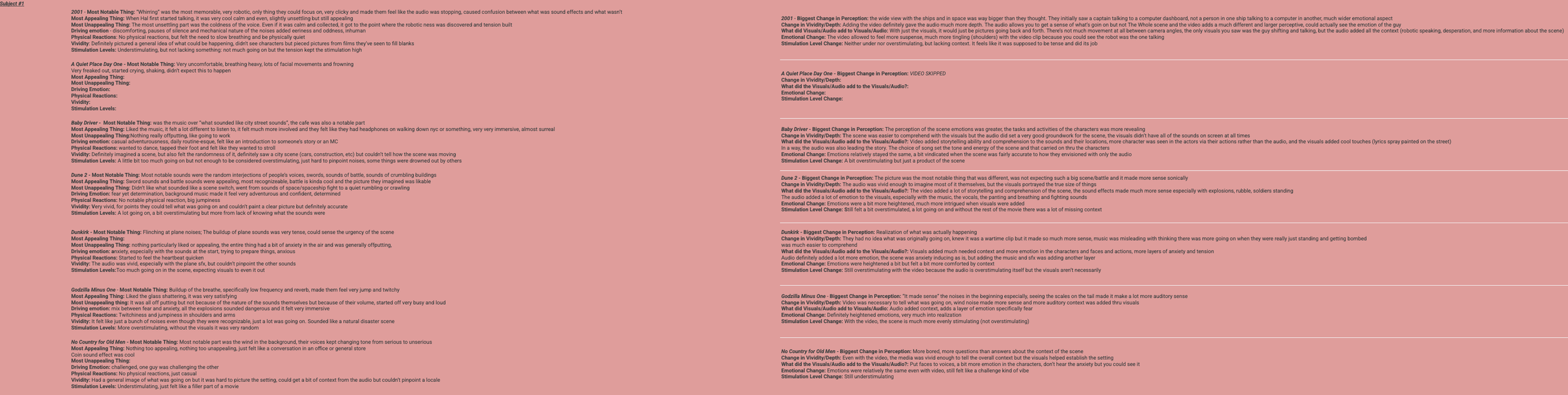 For this movie, a lot of subjects had a focus on the difference between the diegetic and non-diegetic audio; the subjects all noted the music that was playing throughout the whole clip and could hear the different sfx of a city perspective laid over top of it, which allowed a lot of subjects to understand the general setting and layout of the scene; all subjects enjoyed this combination of sound effects and music besides subjects #9 and #10, who found it to be chaotic and overstimulating; for the most part, this mixture of diegetic and non-diegetic sound made for a more immersive experience, allowing the subjects to get a solid understanding of the scene without necessarily needing much of the visuals